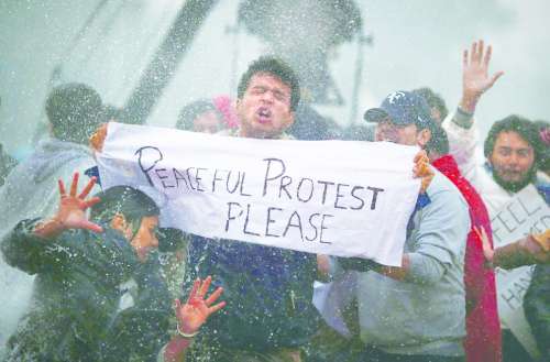 这起骇人听闻的案件曝光之后,印度掀起了大规模的抗议活动。抗议者在首都新德里集会,要求政府惩罚罪犯,并采取强硬的手段保护女性权益。印度政府和首长官邸所在的区域都有重兵把守。一些示威者挥舞着砖头试图冲过警察的戒备,冲入国会大厦,但被警察手中的高压水龙头阻止了。还有一些示威者在抗议中喊着反政府的口号。