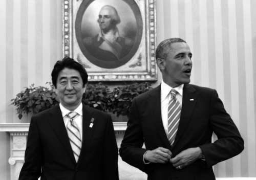 坐在白宫的椭圆形办公室里,安倍双手交握放在膝上,后背挺直,态度微微有些拘谨;奥巴马则放松地靠着椅背,翘着二郎腿,表情却十分严肃。