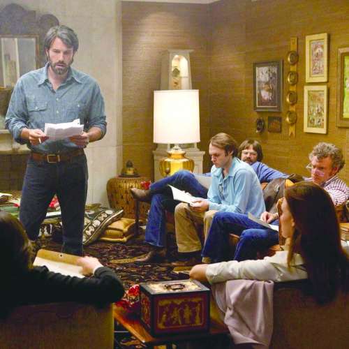 电影《逃离德黑兰》中,托尼·门德兹(左一)为6名美国外交人员介绍脱身计划。 |