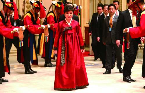 首尔当地时间2月25日,韩国首位女总统朴槿惠身着传统韩服出席晚宴。当天上午,她宣誓就职,正式成为韩国第18任总统。终身未嫁的她,在竞选中称自己“嫁给了国家”,于是,这场有7万嘉宾观礼的就职典礼也就堪称她与韩国的“结婚仪式”。