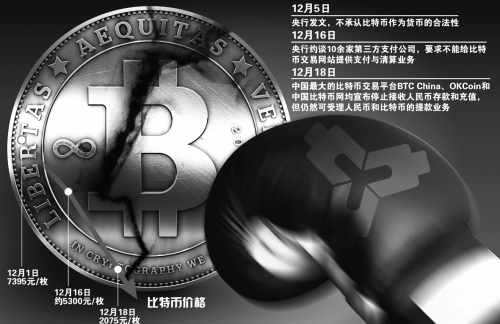 从5800元到3800元,再到2200元,截至12月18日晚的两天时间里,比特币在中国的价格暴跌60%,令一众玩家和投机者震惊。这与中国人民银行近日来接连重拳出击,出台打击虚拟货币巨型泡沫的举措息息相关。路透社称,此举可能造成大规模的比特币交易停止,甚至让比特币在未来退出中国市场。