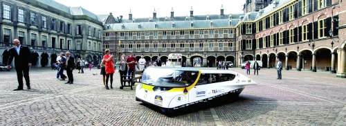 3月31日,TED创新大会期间,太阳能汽车“斯特拉”抵达位于海牙的荷兰议会大厦。该大会的目标是:令公众理解与意识科学是如何为人类创造更加美好的生活。