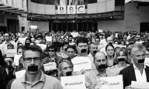 6月24日,BBC的记者和工作人员用黑色胶布封住自己的嘴,并将照片上传至网络,表达对埃及所作所为的抗议。随后,这一做法引来澳大利亚、加拿大、香港等地多家媒体效仿。