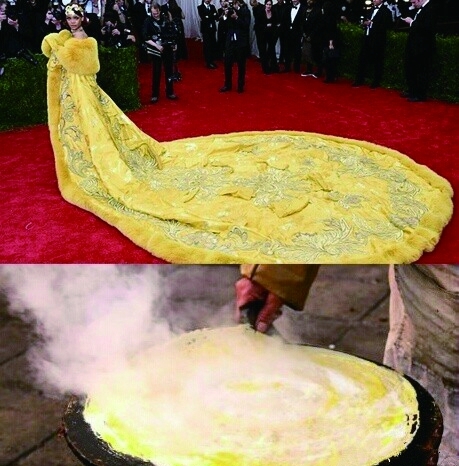 蕾哈娜这套被中国网友吐槽为“鸡蛋灌饼”的黄色礼服,是本场活动中少数出自中国设计师之手的作品,设计师为郭培。不过,蕾姐这身行头很快就被脑洞大开的网友们玩坏了,不少人表示这件黄灿灿的衣服叫人食欲大开,看着它会不由得想起披萨、刚出锅的鸡蛋饼等等。