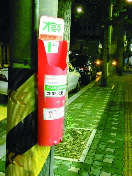 其实,首尔的街道上也不是完全没有垃圾桶,只不过位置比较隐蔽。它不会被安置在繁华路段或大道两边,往往位于人流稀少的小路上,图1中那个悬挂在灯柱上的小桶就是垃圾桶。