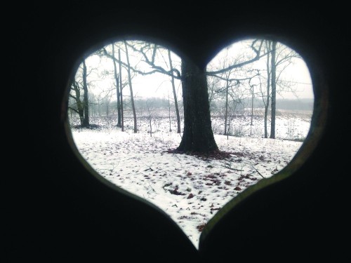 透过这扇心形的窗户,麦克拉看到了心中最迷人的森林雪景。