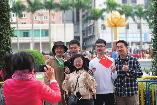 12月20日,澳门特别行政区隆重举行升旗仪式,庆祝澳门回归祖国20周年。图为民众观看升旗仪式后留影。图片来源 新华社