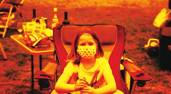1月2日,烟霾将新南威尔士州贝加镇的天空染成红色,一名儿童戴上了口罩。澳大利亚媒体称,山火令澳大利亚多地空气质量堪忧,口罩在首都堪培拉几近脱销。图片来源 英国天空电视台