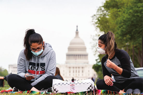 4月19日,在美国首都华盛顿,民众戴着口罩坐在国家广场的草坪上。图片来源 新华社