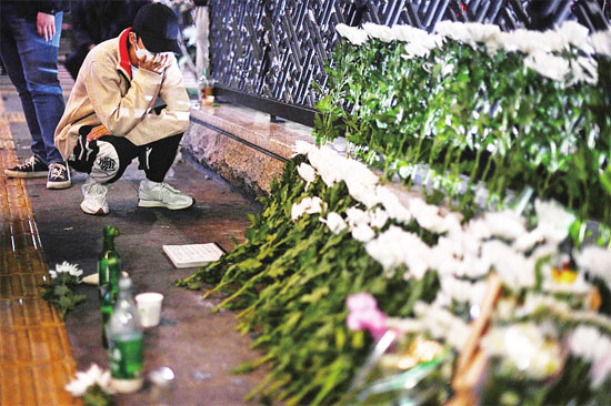 《韩国时报》称,踩踏事件发生后,梨泰院周边出现了许多来自不同国家的哀悼者。有的人准备了手写信件,有的人为遇难者倒上一杯烧酒,也有人留下零食和饮料。