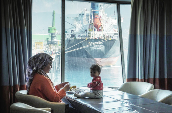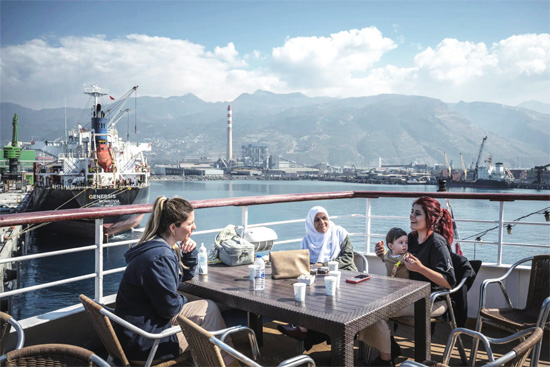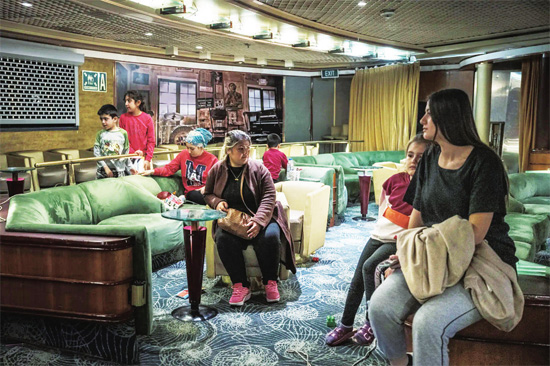 “双子星”号邮轮停泊在土耳其南部海岸边。大剧院成了日托中心,孩子们在那里翻动着人们捐赠的一箱箱玩具。美容院变成了理发店。孩子们在宽阔的甲板上奔跑。一旁,一家人喝着茶,凝视着不远处的群山,那里的废墟掩埋了他们的亲朋好友。
