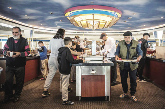 午餐时间,在装饰华丽的“爱琴海餐厅”,难民们排着队,将扁豆、羊肝和米饭舀进塑料盘中。孩子们目不转睛地看着各式各样的甜点,包括橙子片和甜腻的炸面团。