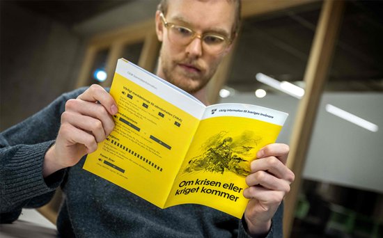 11月18日,瑞典斯德哥尔摩,一名男子正在阅读新版《如果危机或战争来临》手册。因地缘政治局势不断紧张,瑞典、挪威、芬兰政府近期分别向本国民众发放了战时应急手册,敦促人们为“可能发生的战争”做好准备。图片来源 视觉中国