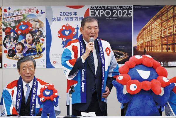 3月24日,日本东京,日本首相石破茂(右)与自民党干事长森山裕出席2025年日本大阪世博会筹备会议。大阪世博会将于4月13日至10月13日举行。图片来源 视觉中国